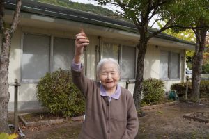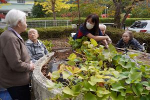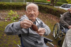 最初は、お芋が見つからず、しかし次第に、「ここにもあった」「こっちにもあった」と大騒ぎのお芋ほりになりました。ある程度周りの土を取り除いてから、利用者様にも実際に掘って頂き・・どの顔もうれしそう。
