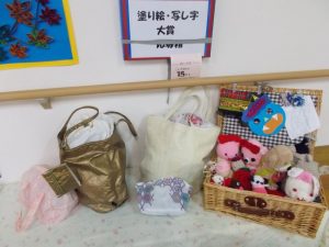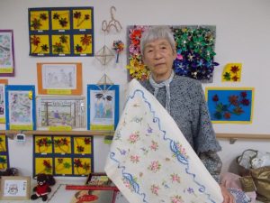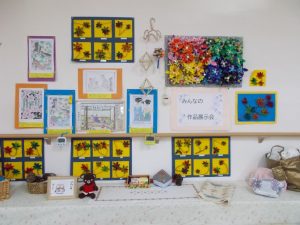塗り絵、折り紙作品、編み物、刺繍、カバン作製、と丁寧に作られた思い思いの作品が集まり、展示棚を設けました。