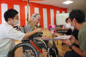 職員による輪っかゲートをくぐり登場されたA様。職員からのお祝いの寄せ書きやお花のプレゼント。また、茶寿にちなみ、お抹茶をたてて紅白饅頭でお祝いしました。
